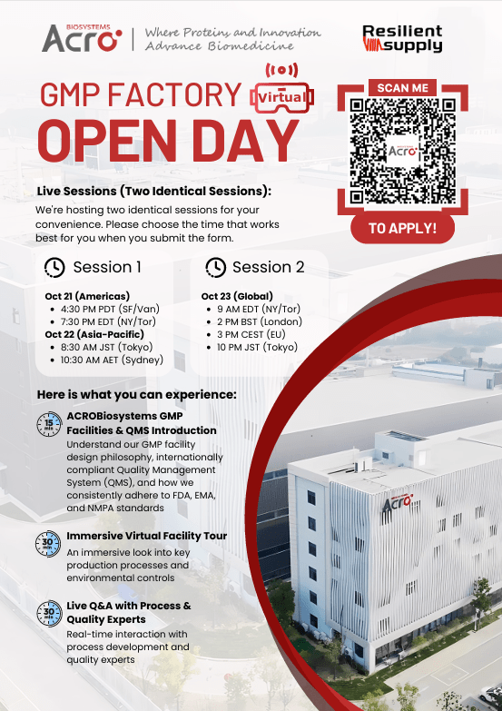 ![]() Welcome to ACROBiosystems’ Intelligent GMP Facility Online Open Day for an immersive virtual tour of our facility designed to help tackle your biologics supply chain & compliance challenges. Using your […] |